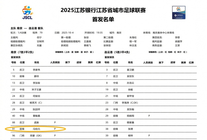 不踢中超踢苏超?冯伯元入选苏超南京队首发,同期段海牛保级大战