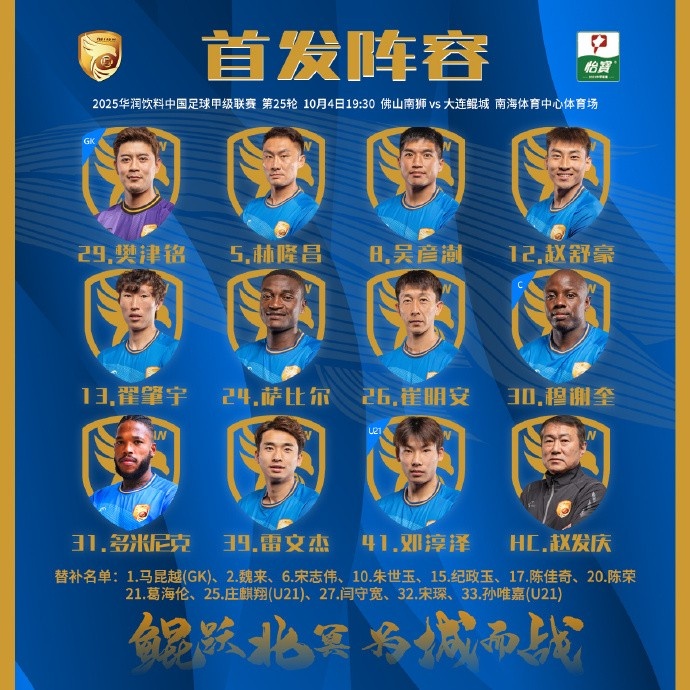 2025中甲联赛第25轮,大连鲲城客战佛山南狮首发出炉!