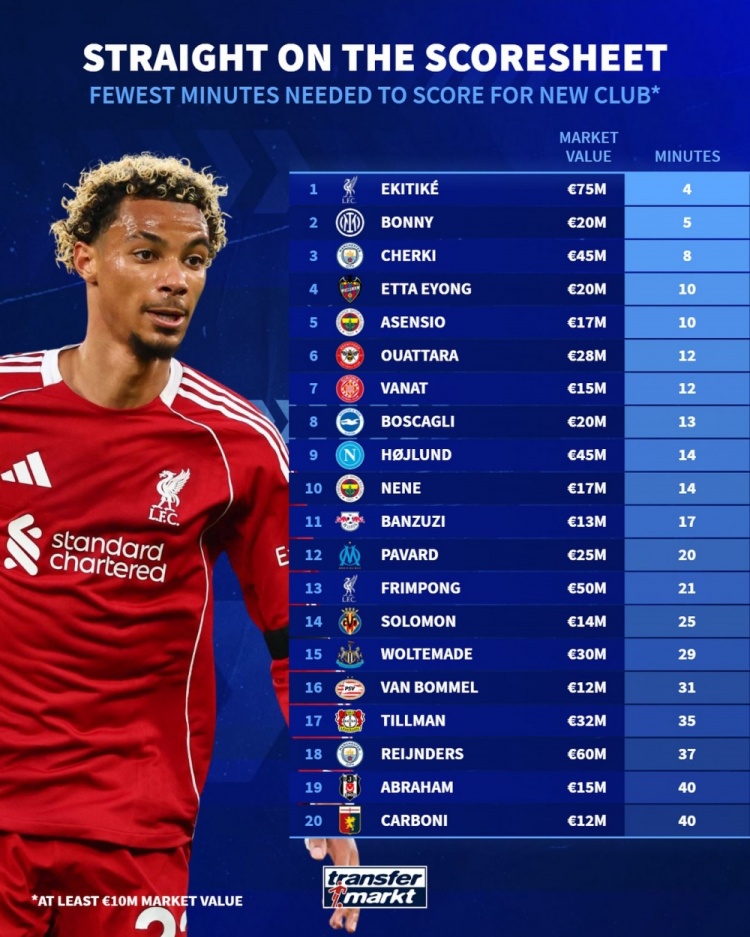 10月8日讯 德国转会商场统计了今夏新援攻入处子球的技巧,并列出最快处子球榜单,埃基蒂克4分钟攻入首球居首。