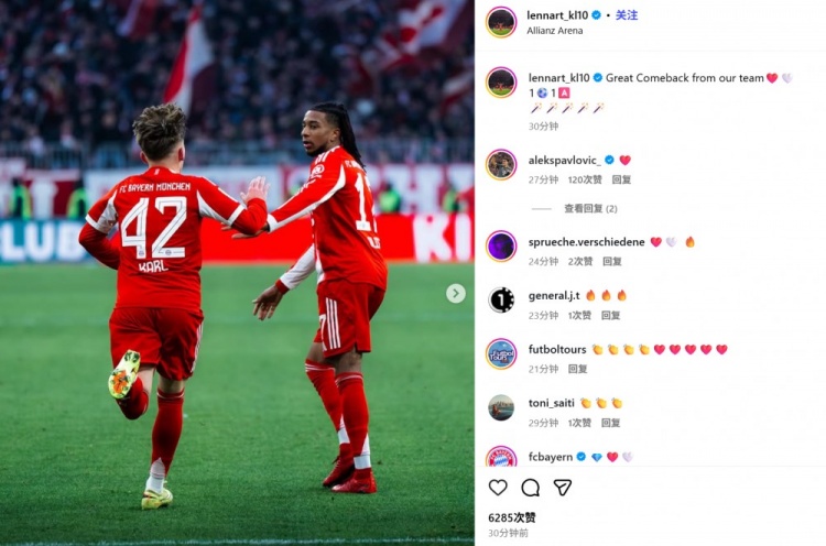 11月23日讯 拜仁在本轮德甲焦点战主场6-2逆转弗赖堡,17岁小将卡尔在上半场和奥利塞相互传射,匡助球队扳平比分。
