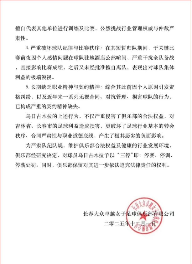 长春各人不凡女子足球俱乐部现负责宣布,对严重违犯球队模范、屡次扞拒合同商定的球员乌日古木拉,给予停赛、停训、停薪的“三停”处罚。