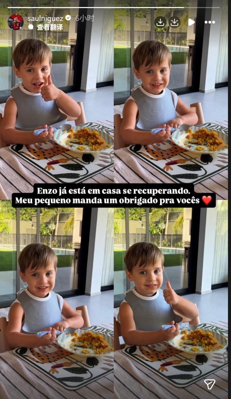 4月24日讯 弗拉门戈中场球员萨乌尔更新社媒动态,确认自己的儿子恩佐已经出院。