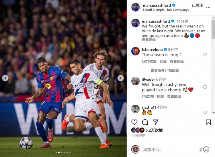 拉什福德社媒晒出比赛相片,并写说念:“咱们尽力战争,但昨晚的比赛成果不如咱们所愿。”