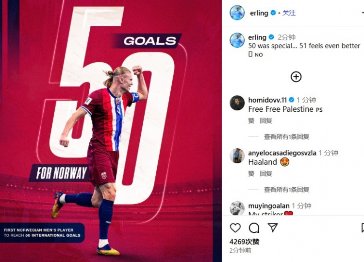 哈兰德在社媒配文中写说念:“第50球很相配……但第51球的嗅觉会更好😉🇳🇴”