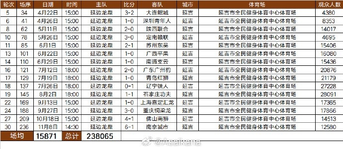 2025中甲联赛延边龙鼎队现场不雅世东谈主数统计:所有238065东谈主次,场均15871东谈主。