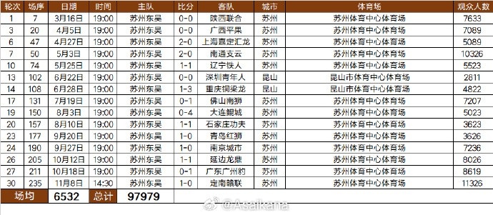 2025中甲联赛苏州东吴队现场不雅世东谈主数统计:所有97979东谈主次,场均6532东谈主。