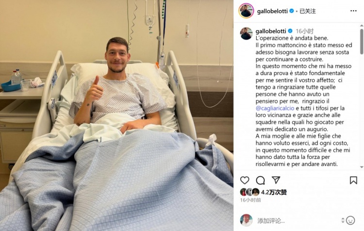 贝洛蒂在外交媒体上发布了术后浅笑的像片并配文:“手术发达获胜。第一块砖照旧铺好了,咫尺咱们要远程赓续开采。在这个繁忙本事,你们的眷注对我至关进犯;我要感谢整个担心我的东谈主,感谢卡利亚里足球俱乐部及举座球迷的补助,也感谢我效率过的整个球队给以我的祝颂。”
