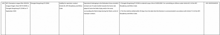 1-成齐蓉城俱乐部因违抗亚足联《次第与说念德准则》第65.1条,被责令支付3000好意思元罚金。