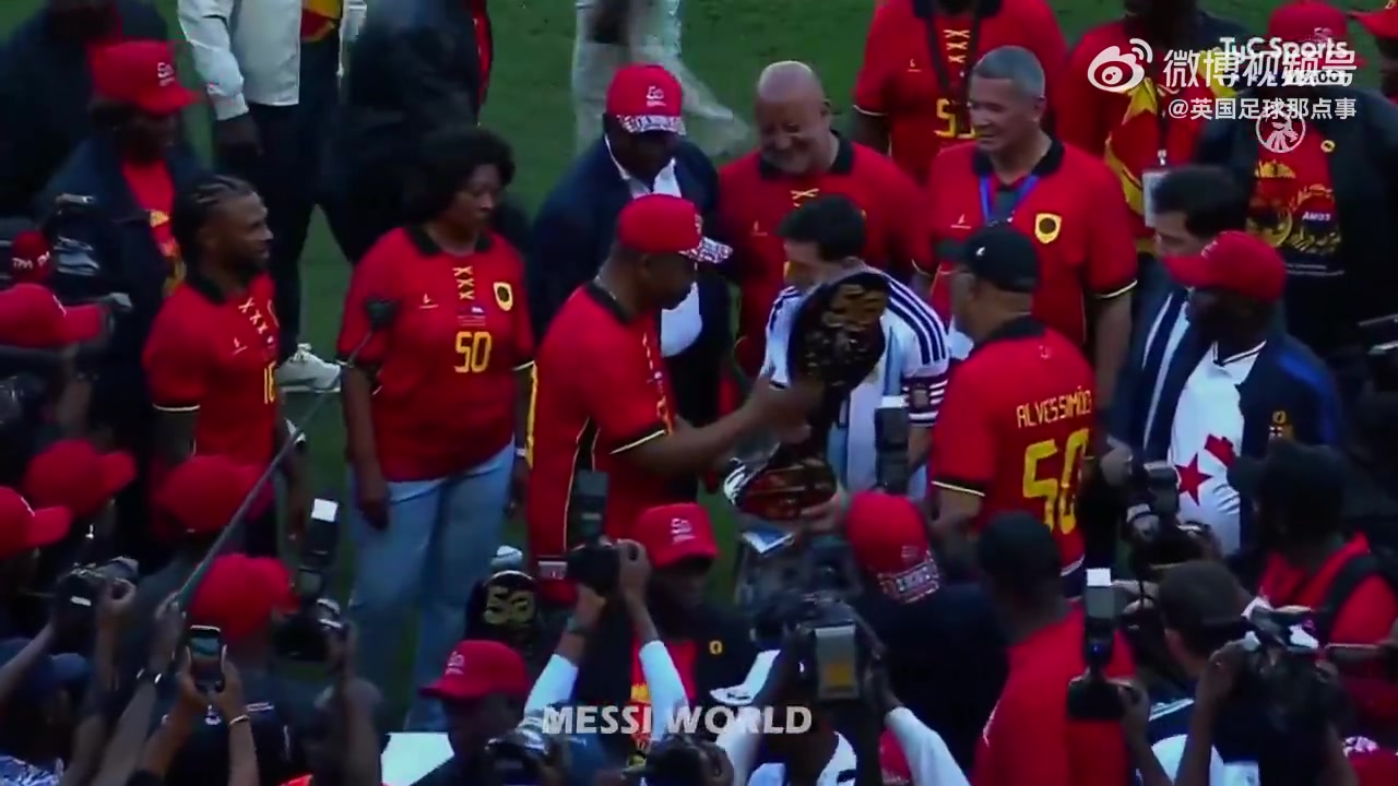 阿根廷与安哥拉比赛前,梅西将球衣赠予安哥拉总统,总统回赠他一座缅想安哥拉独处50周年的特别奖杯。