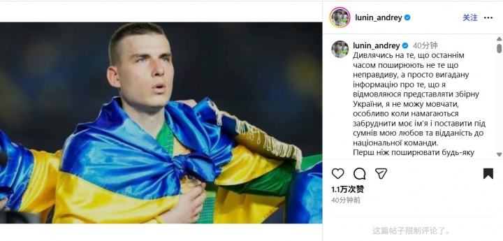 皇马门将卢宁发布社媒,关于联系我方终止为乌克兰出场比赛的报谈进行辟谣,并称我方不成能终止为国度出战。