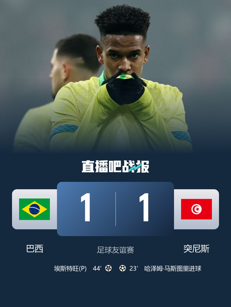 友谊赛对阵,巴西1-1战平突尼斯,埃斯特旺本场点射立功,值得和顺的是米利唐在这场友谊赛受伤了。