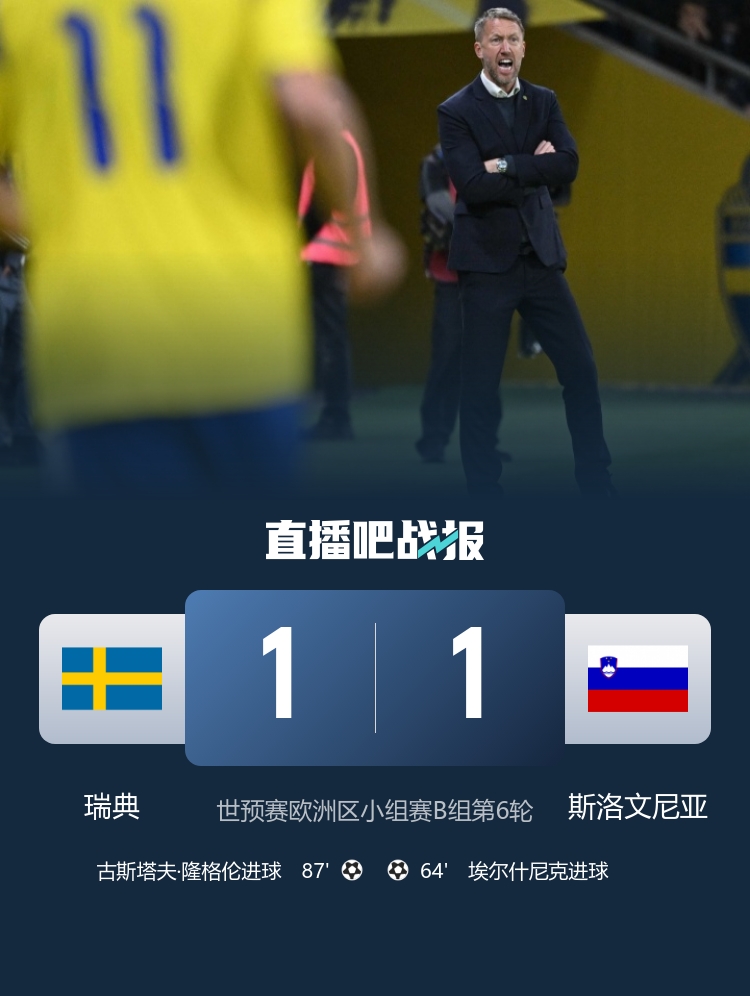 瑞典战平斯洛文尼亚,最终瑞典名次小组垫底,将凭借欧国联的保底资历插足世欧预附加赛。
