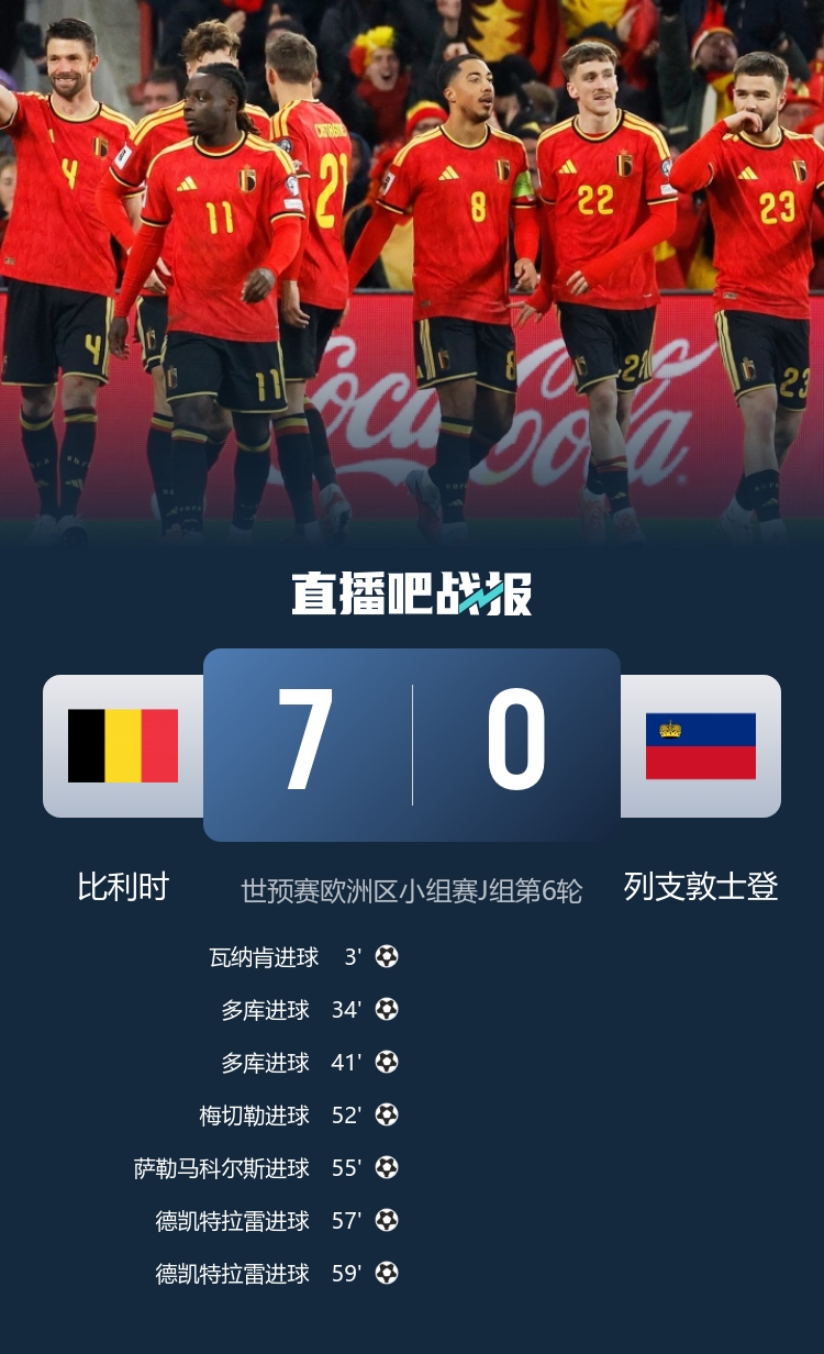 比利时投降列支敦士登,锁定小组头名纵贯晋级2026全国杯。