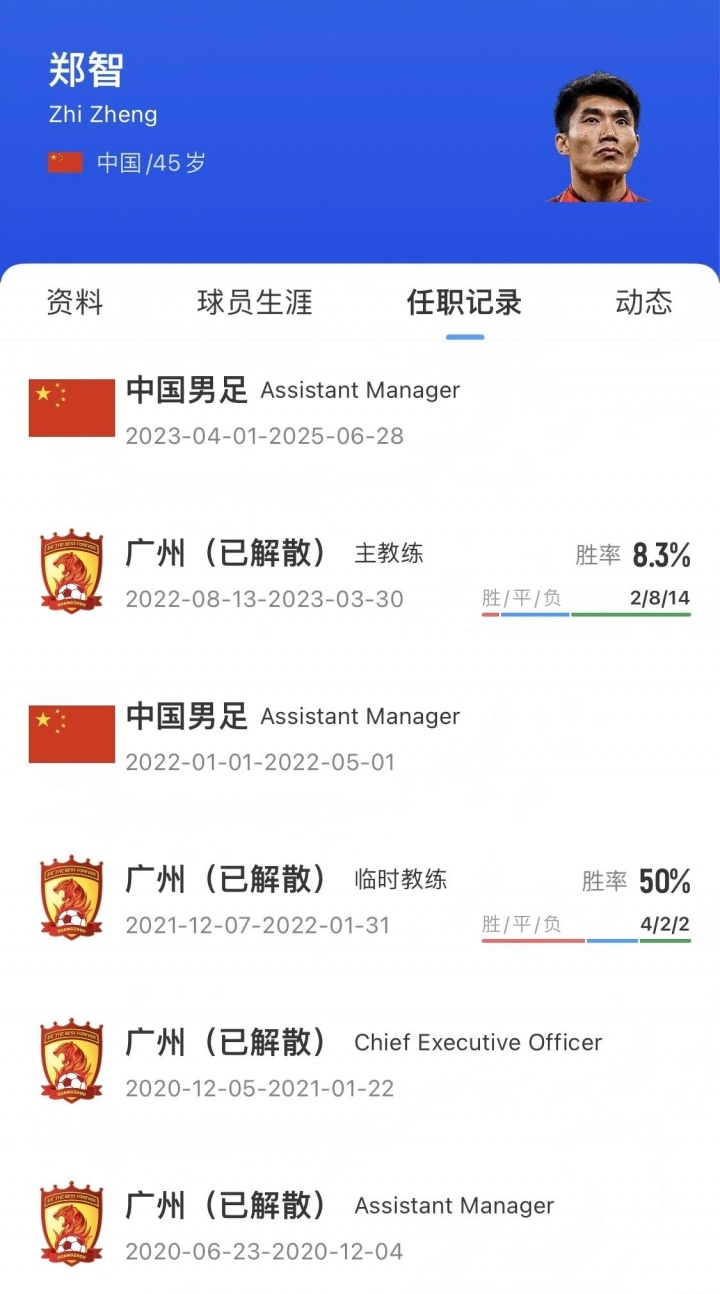 2021年12月7日,郑智出任广州队执行主西宾兼球员。2022年1月,41岁的郑智出战广州队vs长春亚泰的中超比赛,这是他管事生计终末一次出场。2022年8月,郑智出任广州队主西宾。 2023年2月27日,郑智出任国足助教 。跟着伊万离任,郑智也退出洋足助教团队。