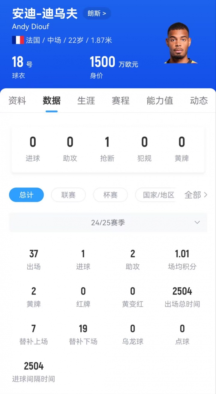 迪乌夫现年22岁,法国中场,上赛季为朗斯出场37次孝顺1球2助攻。现在他的德回身价为1500万欧元。