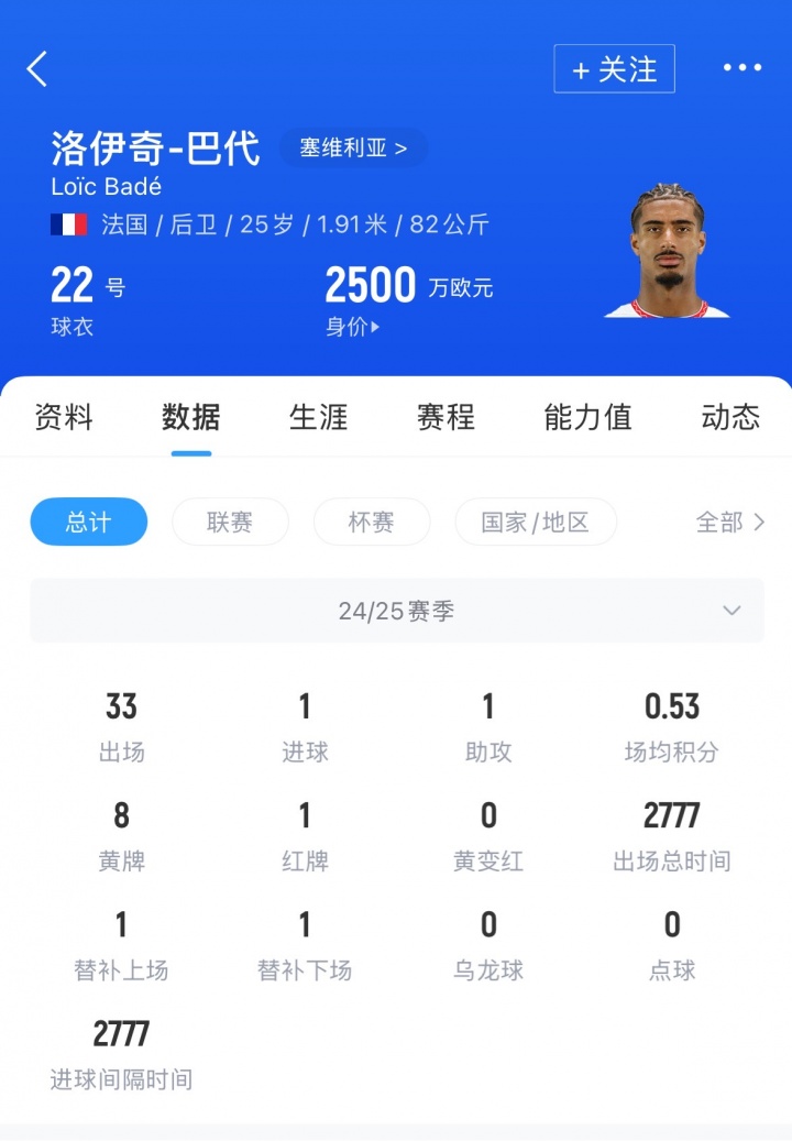 巴代现年25岁,身高1米91,上赛季为塞维利亚出场33场,现身价2500万欧元。