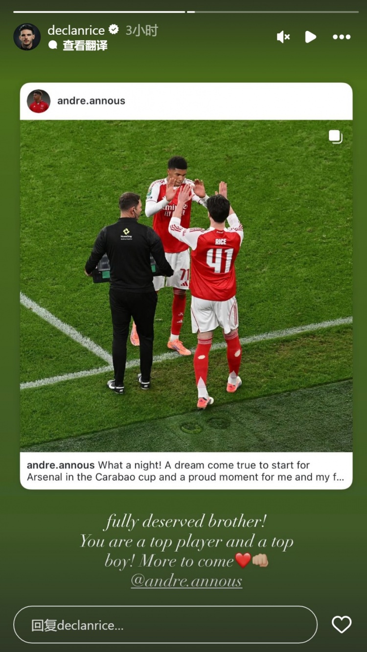 阿森纳中场赖斯社媒转发与安努斯的合照,饱读舞这位小将,配文:“这(首秀)是你应得的,伯仲!你是顶尖的球员,亦然个出色的小伙子!改日会有更多出场。”