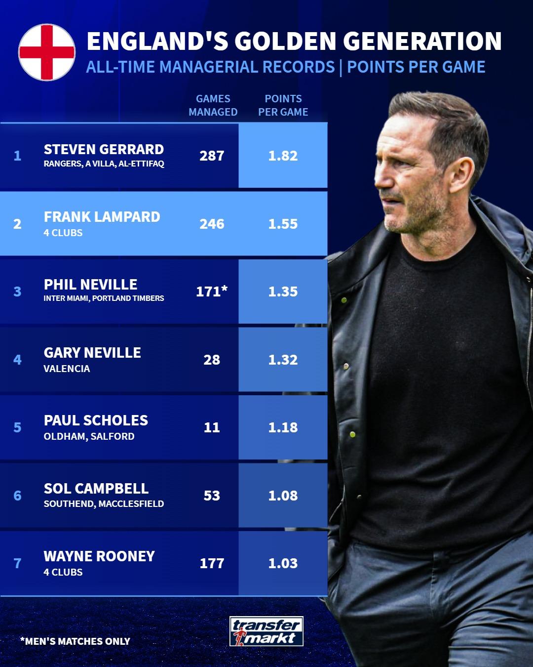 英格兰黄金一代担任训练场均积分: 杰拉德居首, 兰帕德第二
