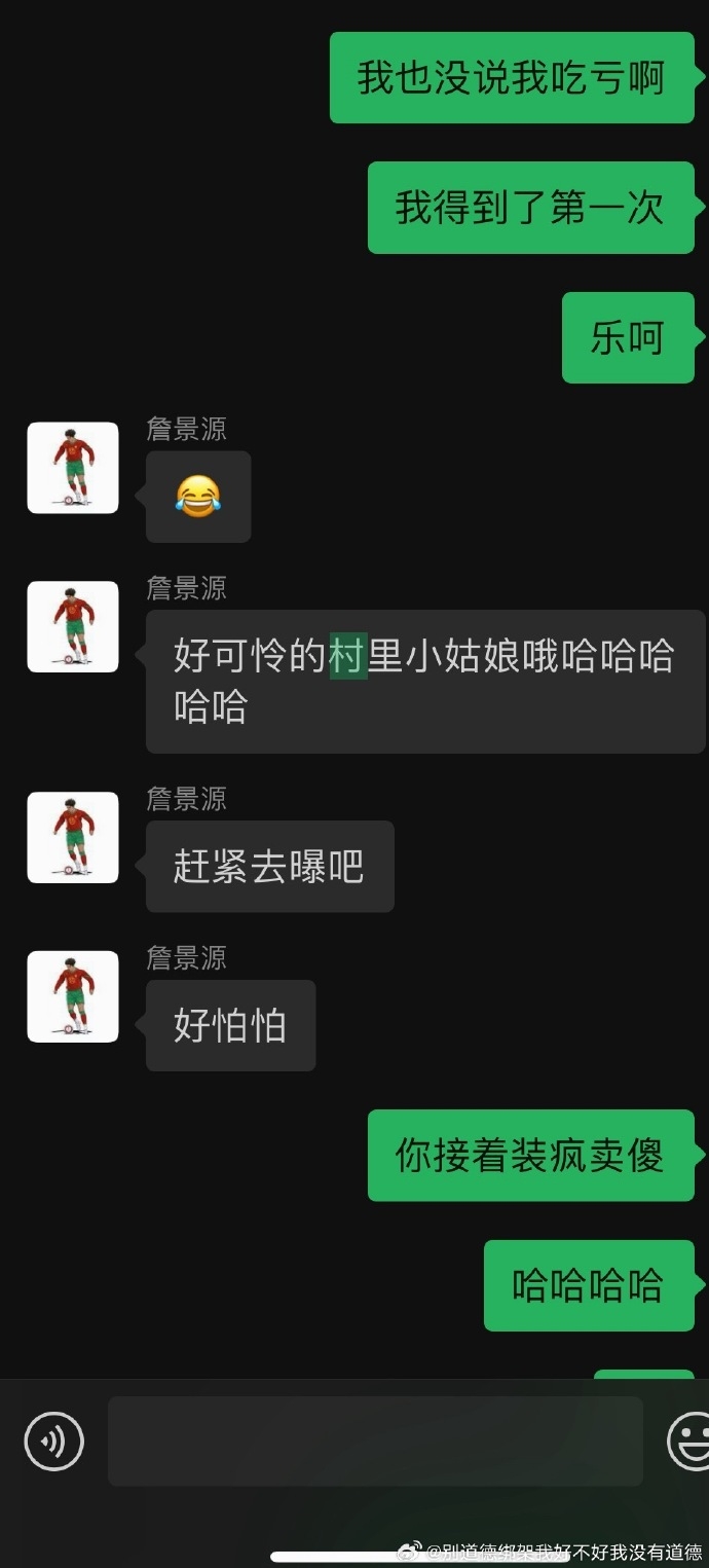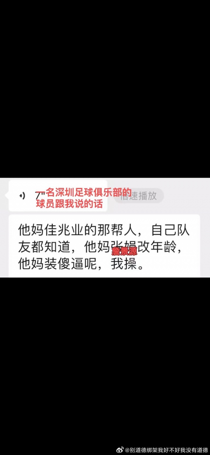微博账号为“别谈德恫吓我好不好我莫得谈德”的网友发文,举报U15国少队员詹景源改年齿,哄骗热诚与其他东谈主乱搞关系。
