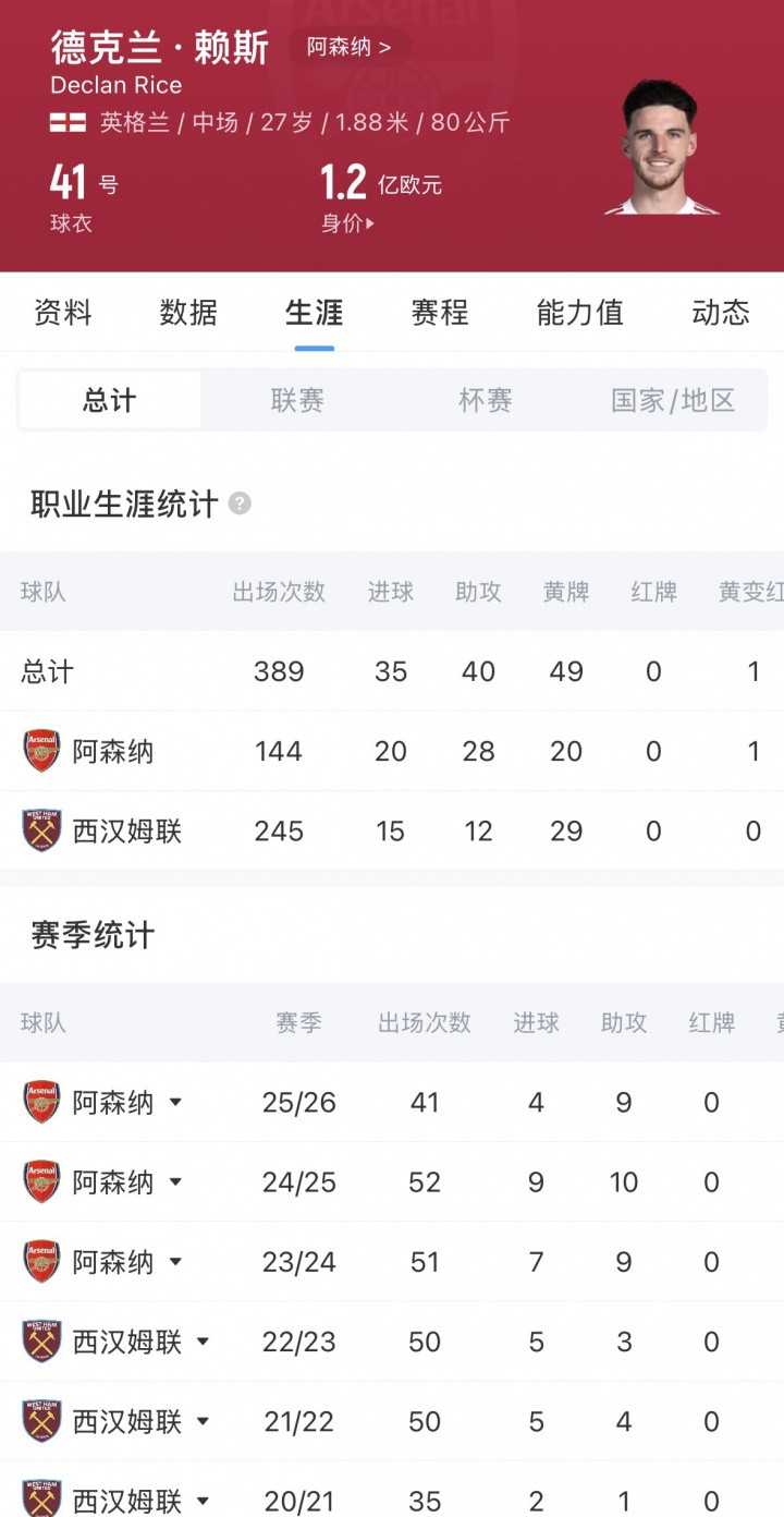 赖斯现年27岁,阿森纳2023年花费1.17亿欧从西汉姆联签下,他为阿森纳效力至今出场144次,贡献20球28助,他现身价1.2亿欧,原运动员劳务协议至2028年。