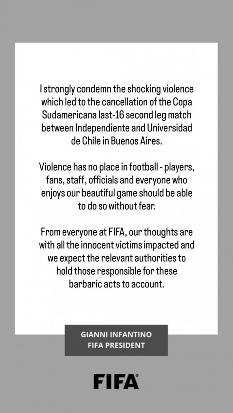 海外足联主席因凡蒂诺社媒责骂暴力四肢,他写说念:“我强烈责骂导致阿根廷孤独队与智利大学队在南好意思杯16强次回合比赛取消的令东说念主惧怕的暴力事件。