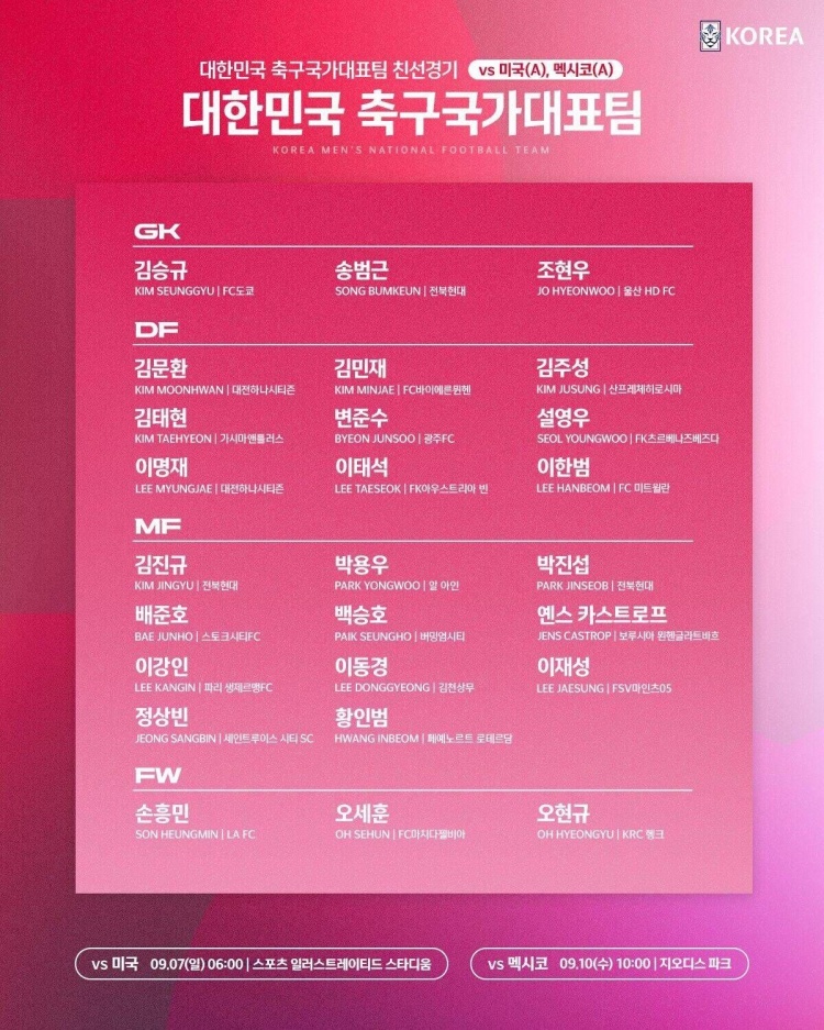8月25日讯 当天,韩国队公布了最新一期国度队大名单,孙兴慜、李刚仁、金玟哉领衔,归化球员卡斯特罗普初度入选。韩国队将在9月飞往好意思国,与好意思国队和墨西哥队交手。