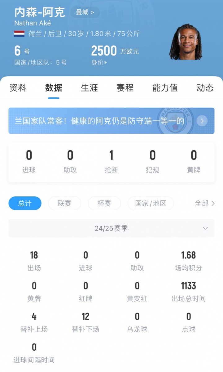 身价2500万!英媒:英超多队专门阿克 曼城愿出售&估价超3000万镑