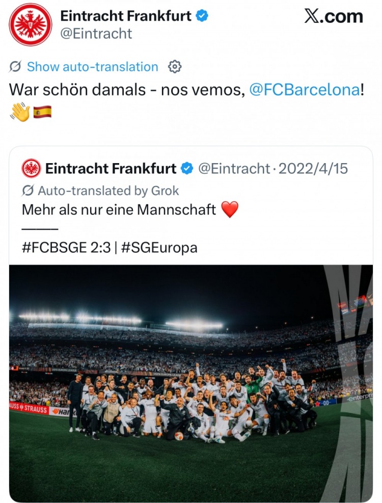 在抽签出炉后,法兰克福官推转发了22年4月,球队在欧联杯1/4决赛次回合客场3-2打败巴萨晋级下一轮的赛后球队合影庆祝告捷的社媒,并配文写谈:“那是一段秘籍的履历,期待咱们的再次相见,巴萨!”