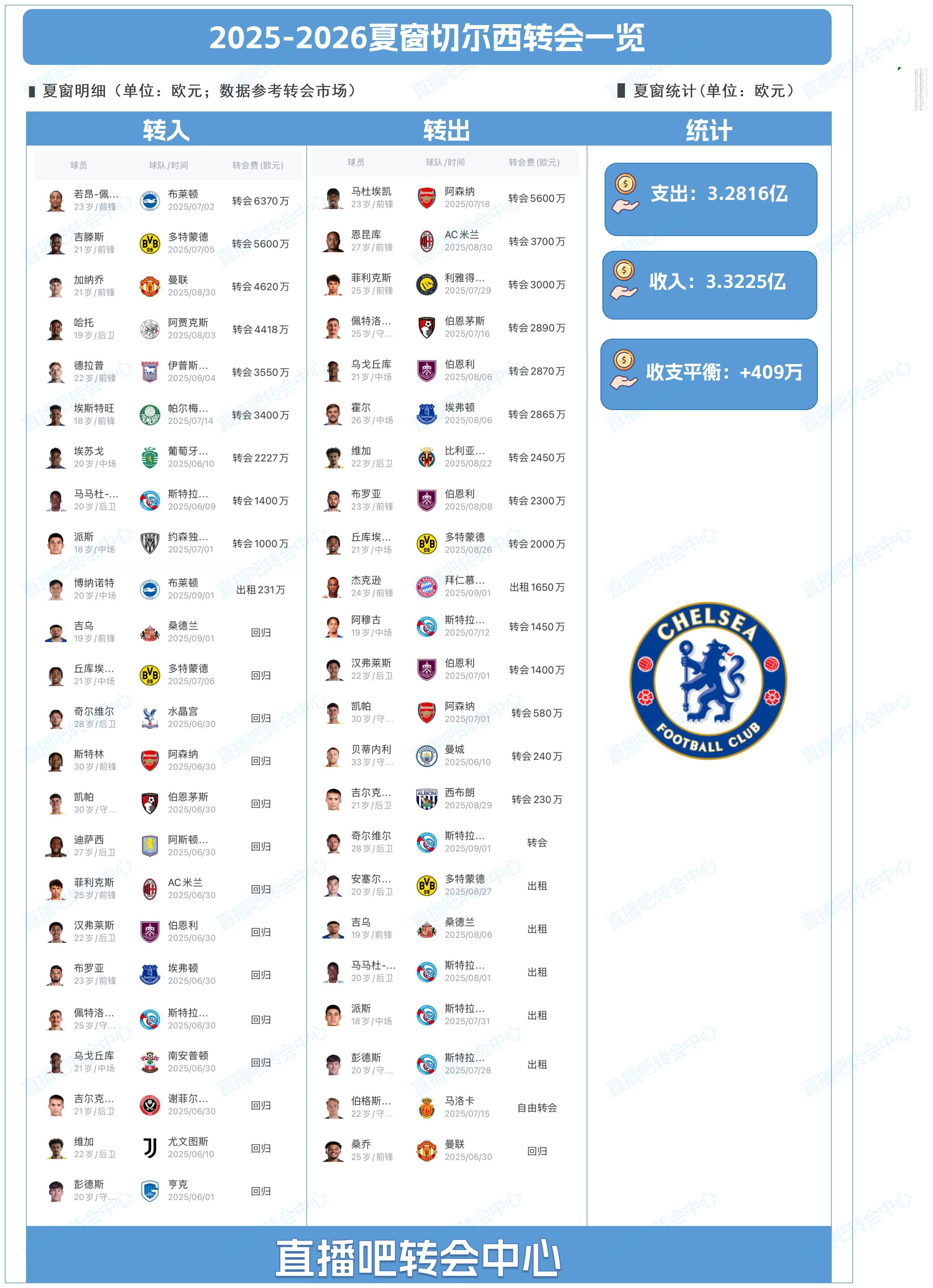 直播吧为吧友们转头了切尔西今夏的转会操作,吧友们能打几分?