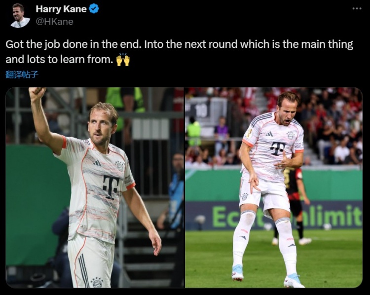 8月28日讯 在拜仁3-2打败韦恩,晋级德国杯第二轮后,凯恩更新了酬酢媒体。