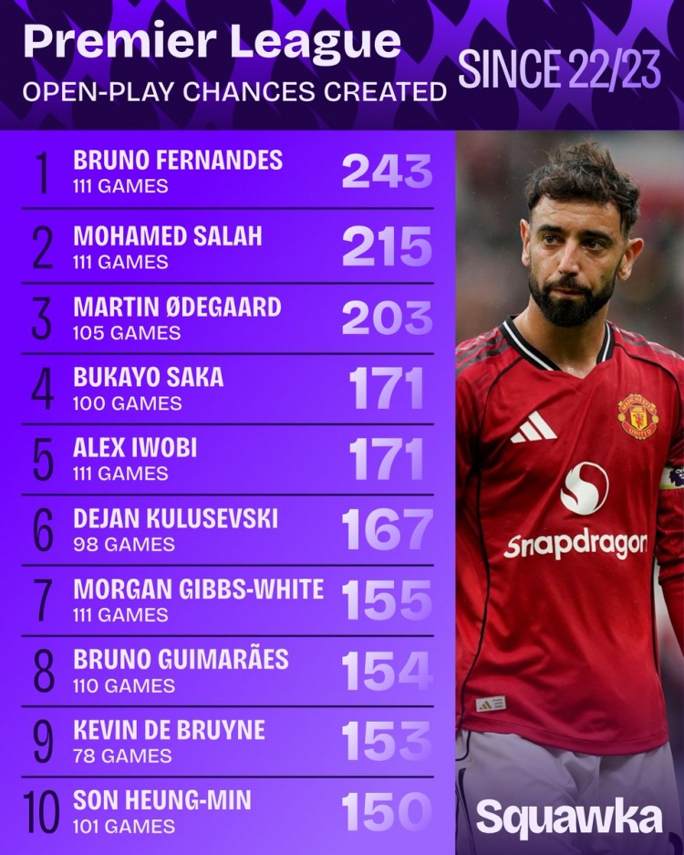 9月11日讯 数据认知,自2022/23赛季运转,B费是英超畅通战创造契机最多的球员。