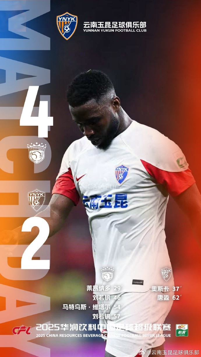 2025华润饮料中超联赛第24轮,客场作战的云南玉昆最终以2比4不脑怒手。上半场,奥斯卡接侯永永的助攻,头球破门一度扳平比分。但下半场开场后,在10分钟之内咱们被敌手连进三球。随后,唐淼打进加盟后个东谈主首球。