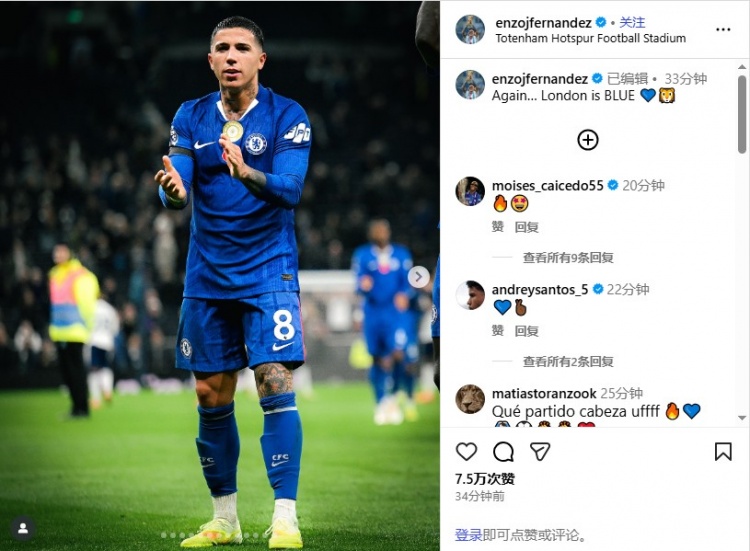 恩佐上传了我方在比赛中的像片,并配文写说念:“再一次……伦敦是蓝色的💙🦁”。