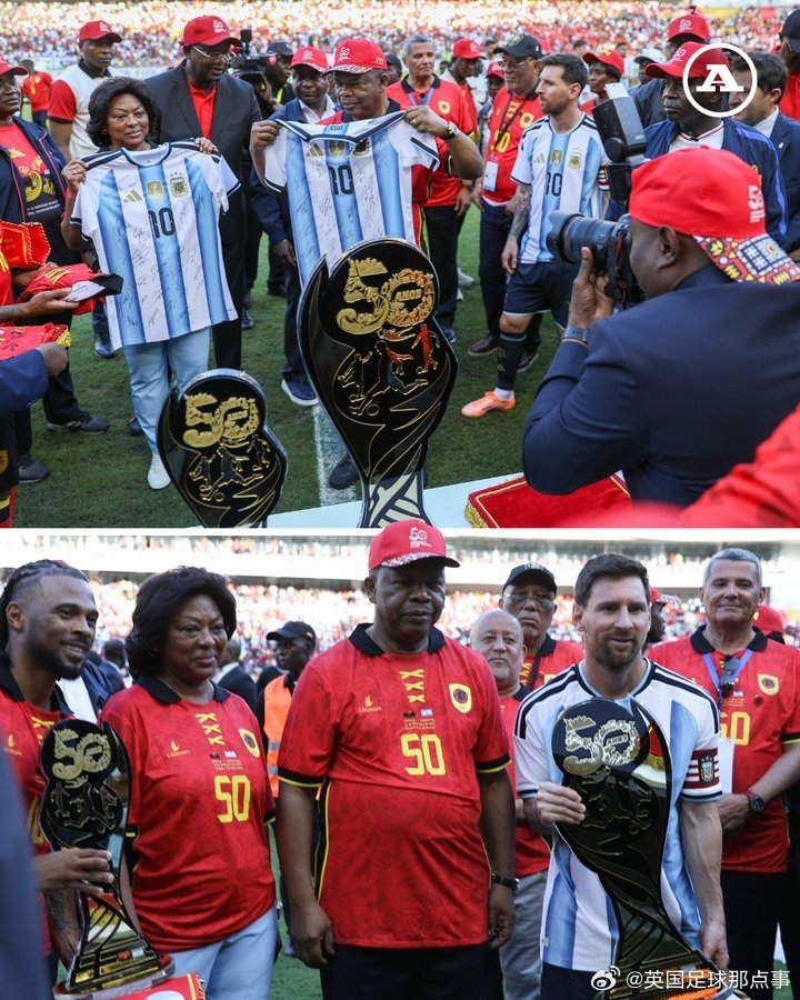 阿根廷与安哥拉比赛前,梅西将球衣赠予安哥拉总统,总统回赠他一座纪念安哥拉稳固50周年的相配奖杯。