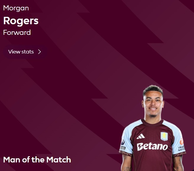 双响+恣意球制胜,摩根·罗杰斯当选维拉2-1利兹联全场最好球员