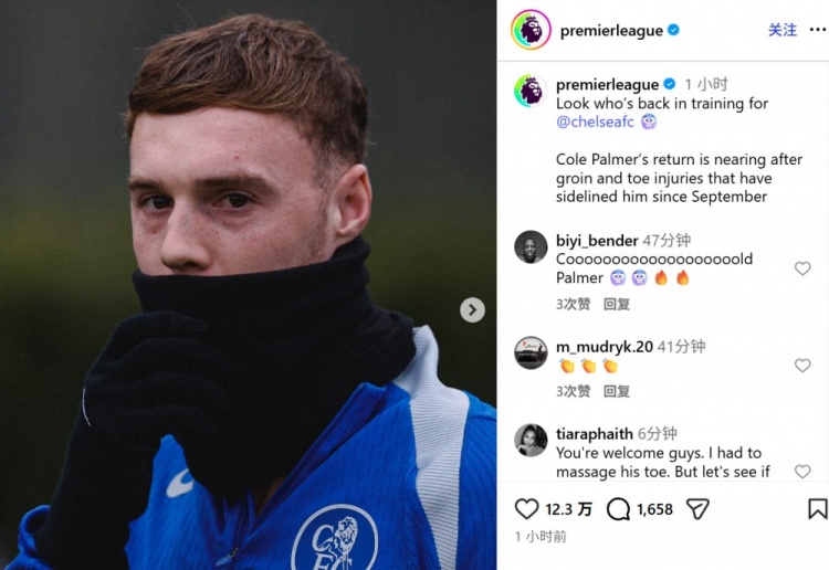 望望是谁回来了?!帕尔默干与切尔西本日历练,本赛季4场2球
