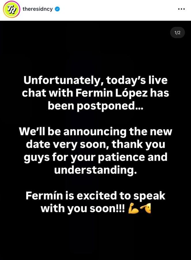 原来费尔明今天将进入外交媒体平台The Residency的直播对话活动,但平台方面暗意活动依然被推迟,并暗意很快会秘书新的活动日历。